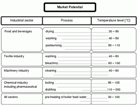 The table excludes the sectors of pulp and paper (mostly higher temperature levels, often heat from CHP available), chemicals and rubber (mostly higher temperature levels, often high waste heat potentials), glass, cement and basic metals (mostly higher temperature levels). However, it is quite possible that interesting application possibilities also in these sectors are identified during the project.